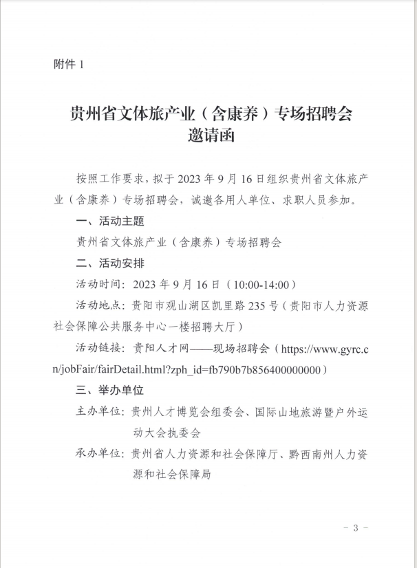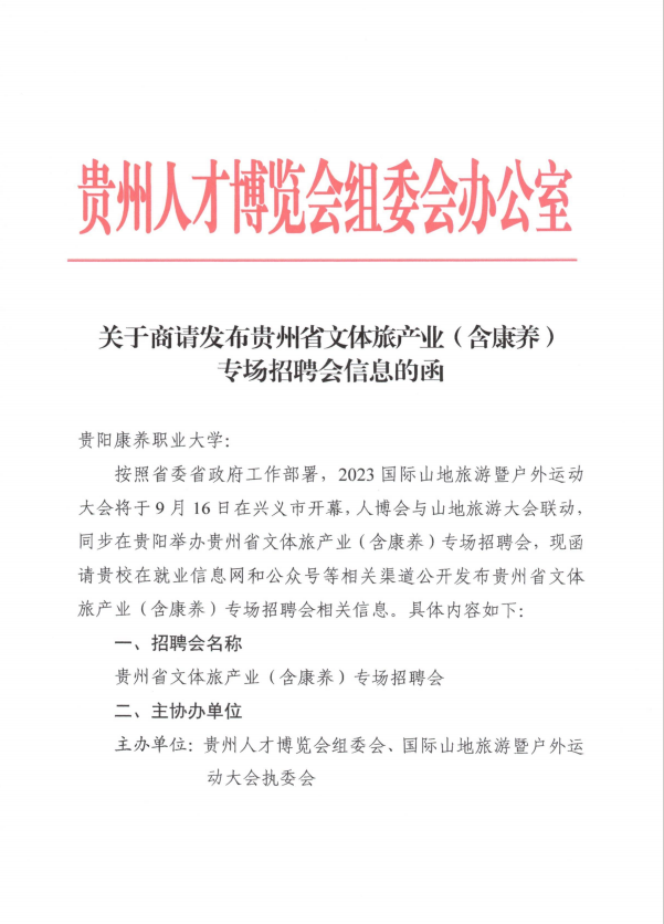 关于商请发布贵州省文体旅产业(含康养)专场招聘会信息的函