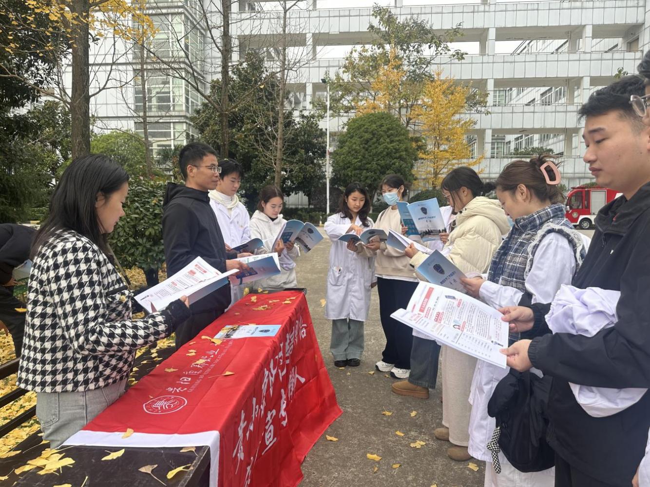 午后下课,阳光洒在新综合实训楼前的湖面上,波光粼粼,宛如一片金色的海洋。银杏道旁的反诈宣传摊前,护校安园社团志愿者们将“刷单返利”的警示单递到驻足同学手中,银杏叶如金色蝴蝶般飘落在“守住钱袋子”的宣传标语旁轻轻打转。