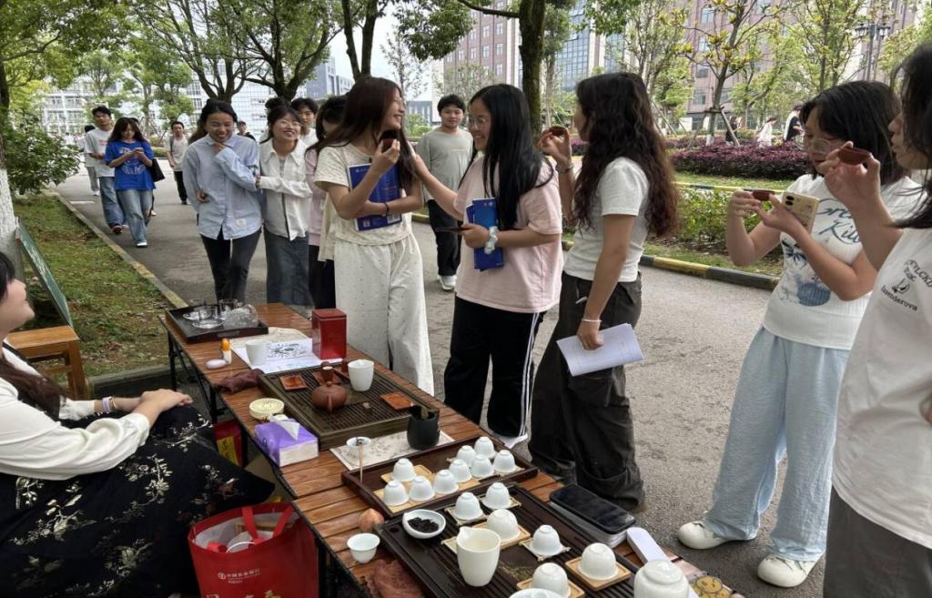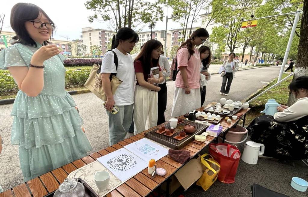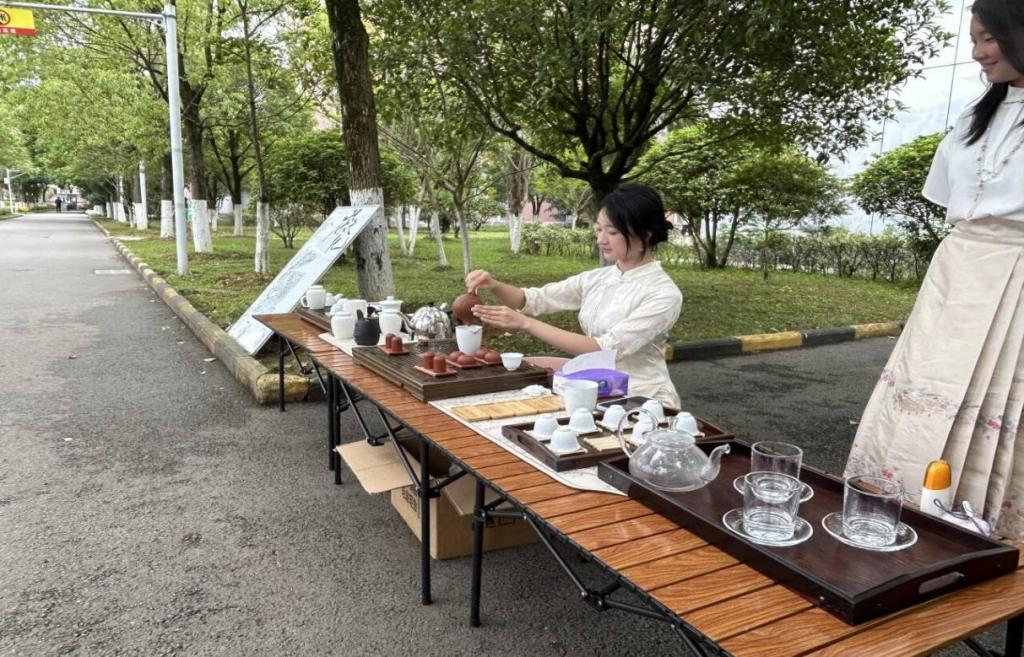 活动伊始,茶艺社的专业人员开始展示精湛的茶艺茶道。他们动作娴熟,有条不紊地冲泡着各类茶叶,从温杯、投茶到注水、出汤,每一个步骤都如行云流水般自然流畅,充分展现了中国传统茶艺的优雅与魅力。2025年6月9日,“探韵乌龙,共品茶香”活动在篮球场对面开展。