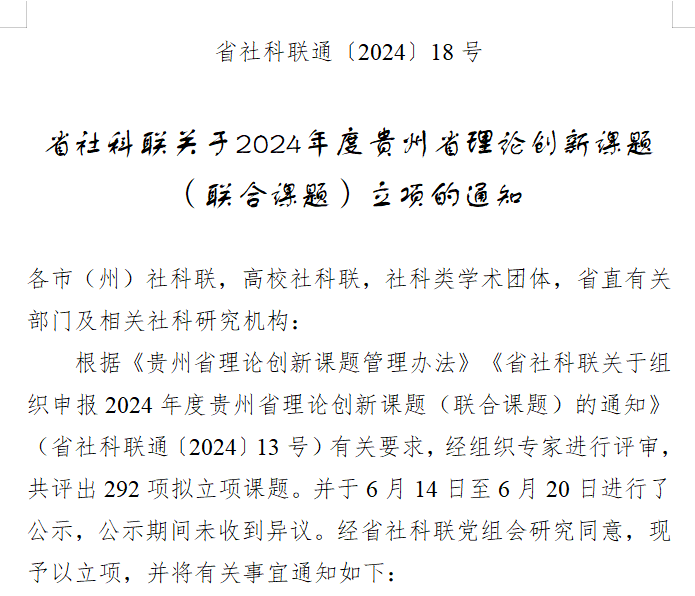 2024年度贵州省理论创新课题(联合课题)立项的通知》(省社科联通〔2024〕18号),我